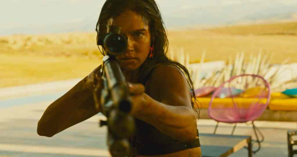 Revenge n’en reprend pas moins grosso modo le schéma typique du « rape film »; une trame en trois actes : viol, survie, vengeance, avec une représentation très graphique de la violence. Le « regard féminin » que la réalisatrice porte sur le genre se manifeste d’abord par une représentation plus authentiquement « féministe » de la protagoniste jouée avec beaucoup de cran par Mathilda Lutz . On devine ainsi très vite que son apparence initiale de poupée de luxe n’est qu’une façade. Chacune des crapules males se voit également attribuer des tares machistes distinctes auquel on a quand-même donné une graine d’humanité afin de ne pas juste en faire des caricatures trop bêtement simplistes sans relief et donc sans intérêt.