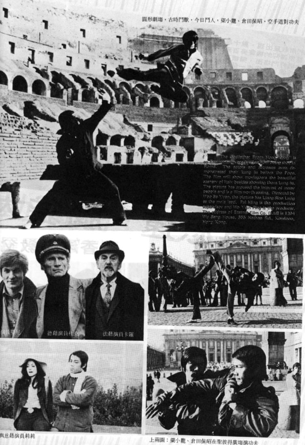 En fait le combat a été tourné à Hong-Kong comme l’ensemble du film, mais Bruce, Chuck et la vedette féminine du film Nora Miao se sont tous rendus à Rome pour tourner quelques bouts de scènes dans des lieux iconiques de la Cité éternelle.