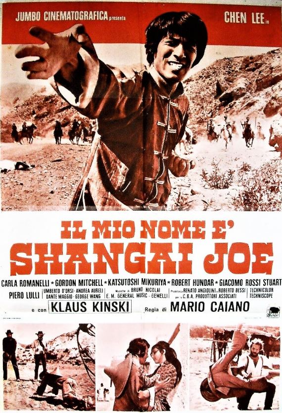 Le premier est Il mio nome è Shanghai Joe (Mon nom est Shanghai Joe) aka : The Fighting Fist of Fighting Joe. C’est un western reprenant la prémisse de base de la série TV américaine Kung Fu en suivant les péripéties d’un chinois martial errant dans le Far West. Le personnage est toutefois joué par un japonais. L’acteur culte Klaus Kinski est le méchant. Le film connaitra une suite : Che botte ragazzi! ou Il ritorno di Shanghai Joe en 1975.
