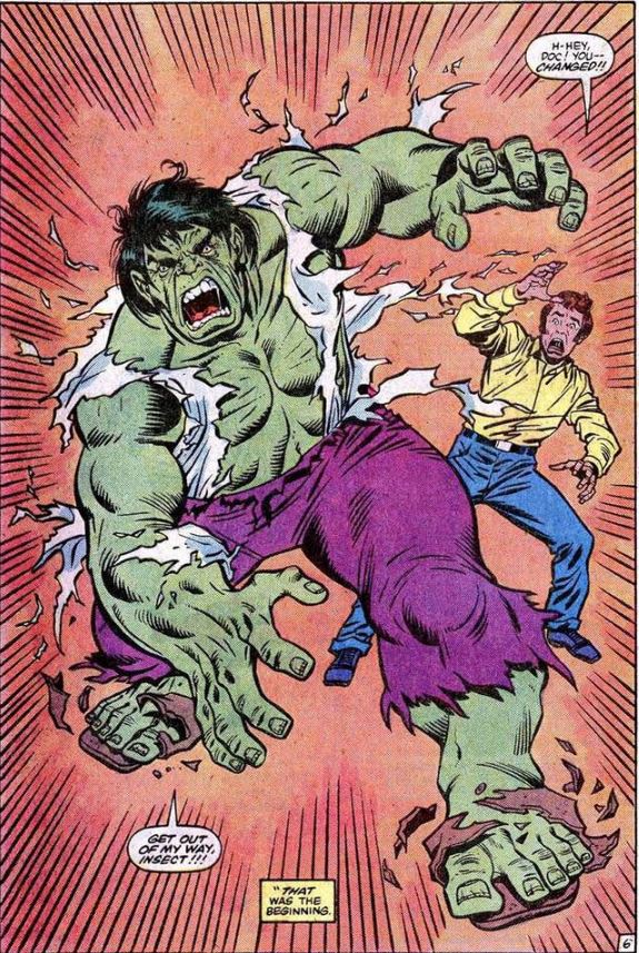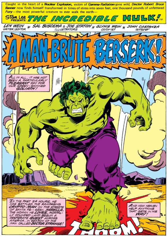 Sans aucun doute, la contribution la plus marquante de Sal Buscema aura été la série Incredible Hulk, qu’il a illustrée pendant une décennie, de la moitié des années 1970 à la moitié des années 1980. Il a marqué toute une génération en définissant non seulement l’apparence du Goliath Vert, mais aussi sa personnalité tragique : celle d’un monstre-enfant solitaire et incompris, animé par une colère destructrice, mais possédant un fond d’innocence touchante.