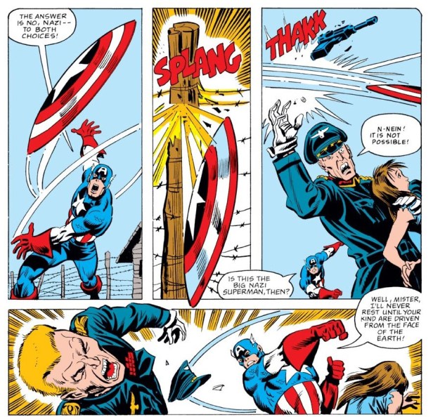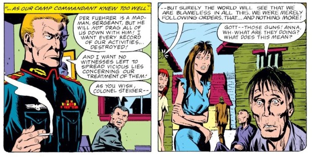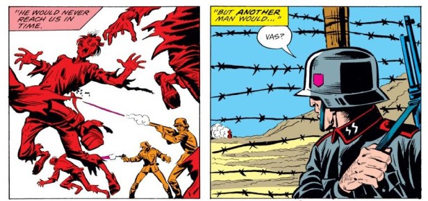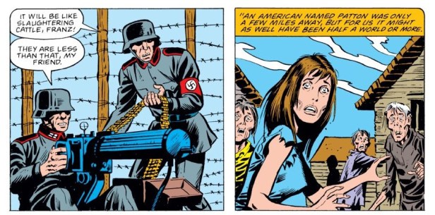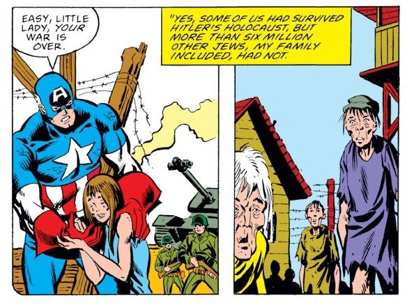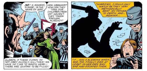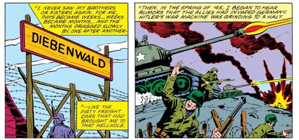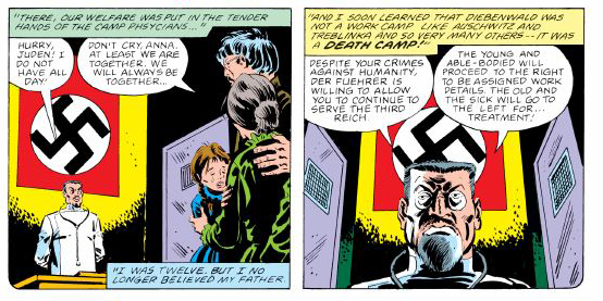 Plus loin dans le même comics, un flash-back présente l’histoire d’une survivante d’un camp Nazi. Cette lecture a dû constituer l’introduction de bien des jeunes lecteurs aux horreurs de La Shoah
